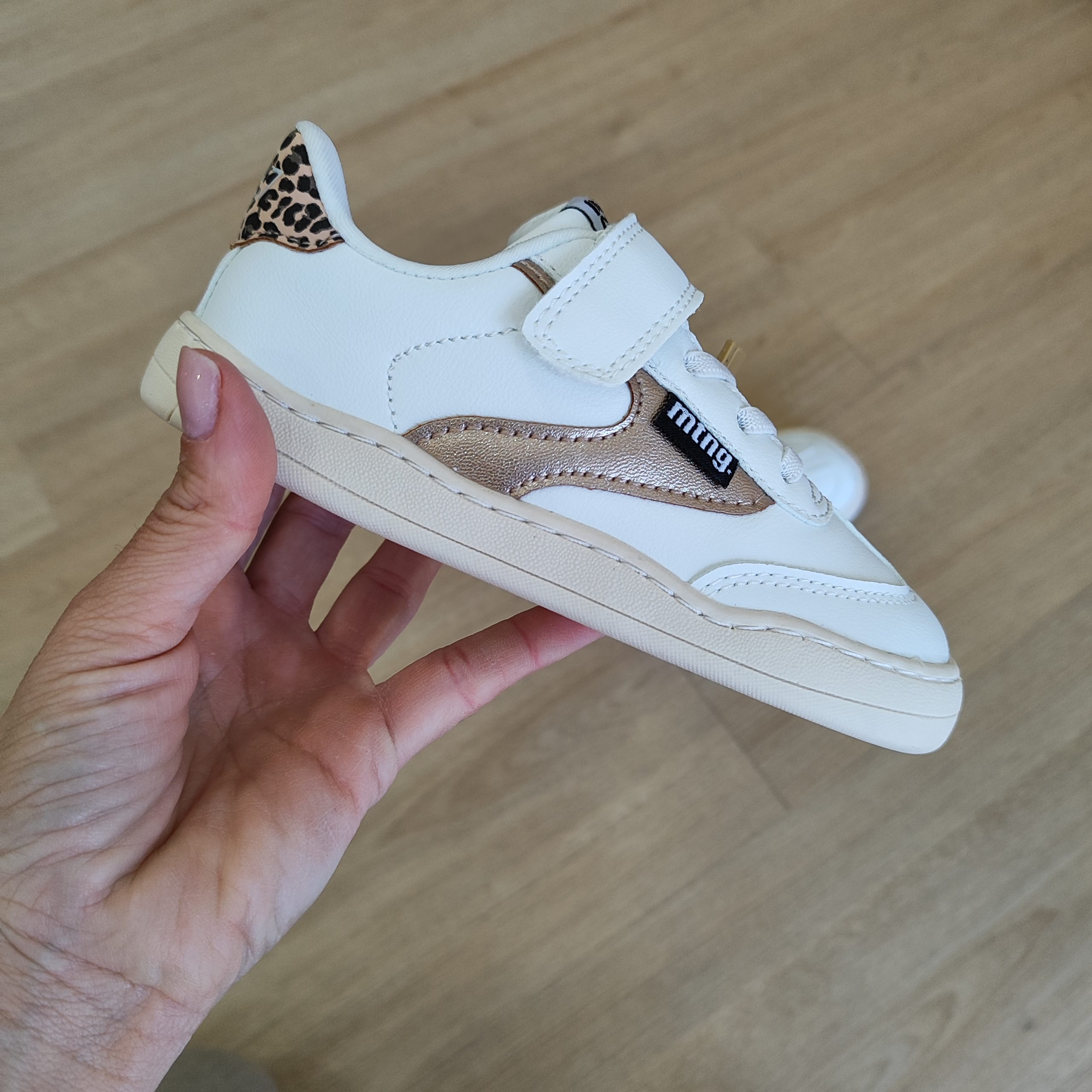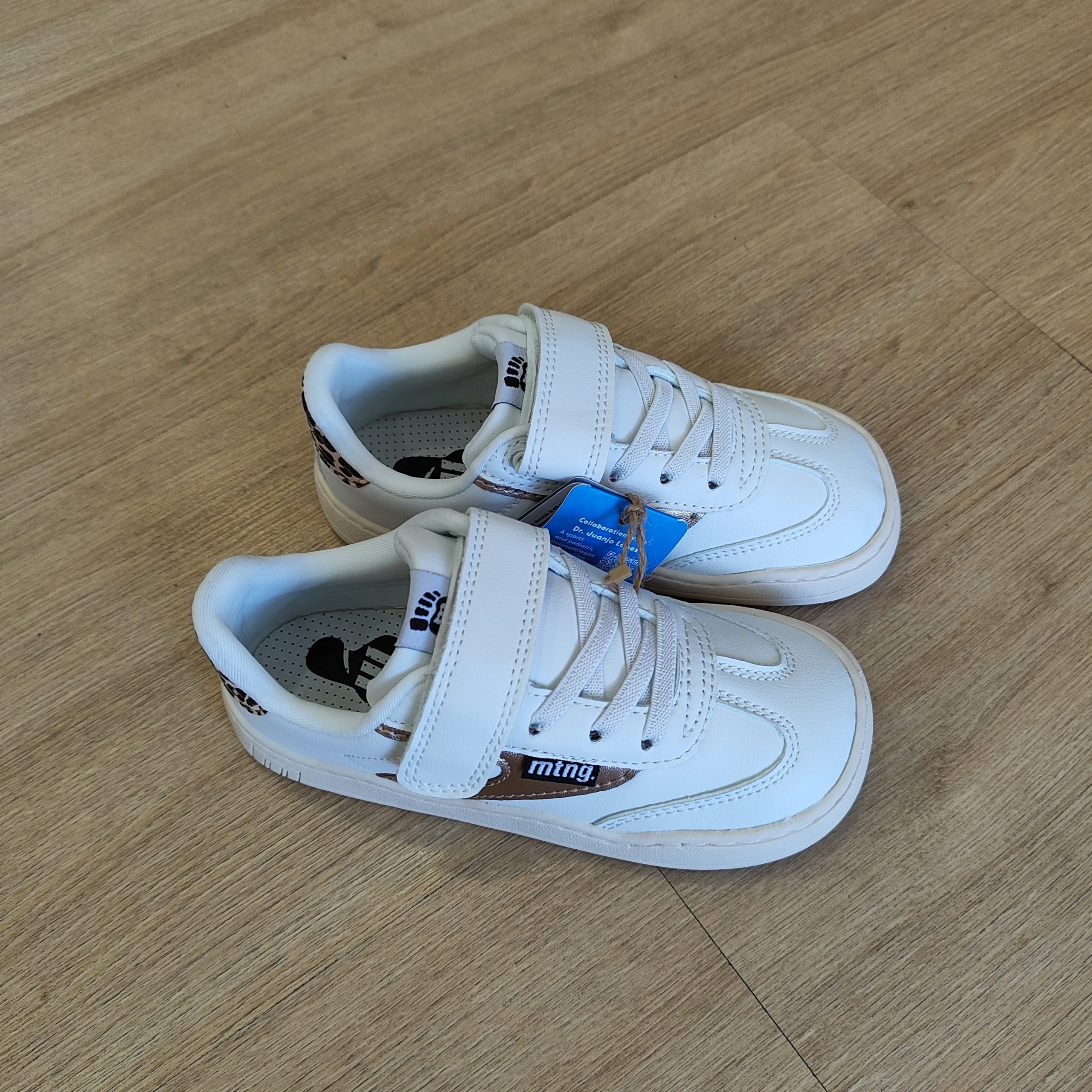 Zapatillas barefoot lavables de color blanco para niña, modelo Free de la marca Mustang, estilo urbano. Incorpora detalles metalizados dorados y talón con estampado animal print de leopardo que aportan un toque distintivo al diseño. El cierre adhesivo y los cordones garantizan un ajuste cómodo y práctico. Diseñado y desarrollado especialmente en colaboración con el Dr. Juanjo López, traumatólogo deportivo e infantil, para respetar el desarrollo natural del pie del niño y la niña. Gracias a su puntera ancha permite el libre movimiento de los dedos dentro del zapato. Las plantillas extraíbles facilitan comprobar si la talla del calzado es la correcta para tu hijo. Además, su fácil apertura facilita que el niño pueda descalzarse y calzarse de forma autónoma. Con certificado VEGANO sellado por INESCOP, el cual garantiza que la naturaleza química principal del material no se corresponde con fibras de origen animal.