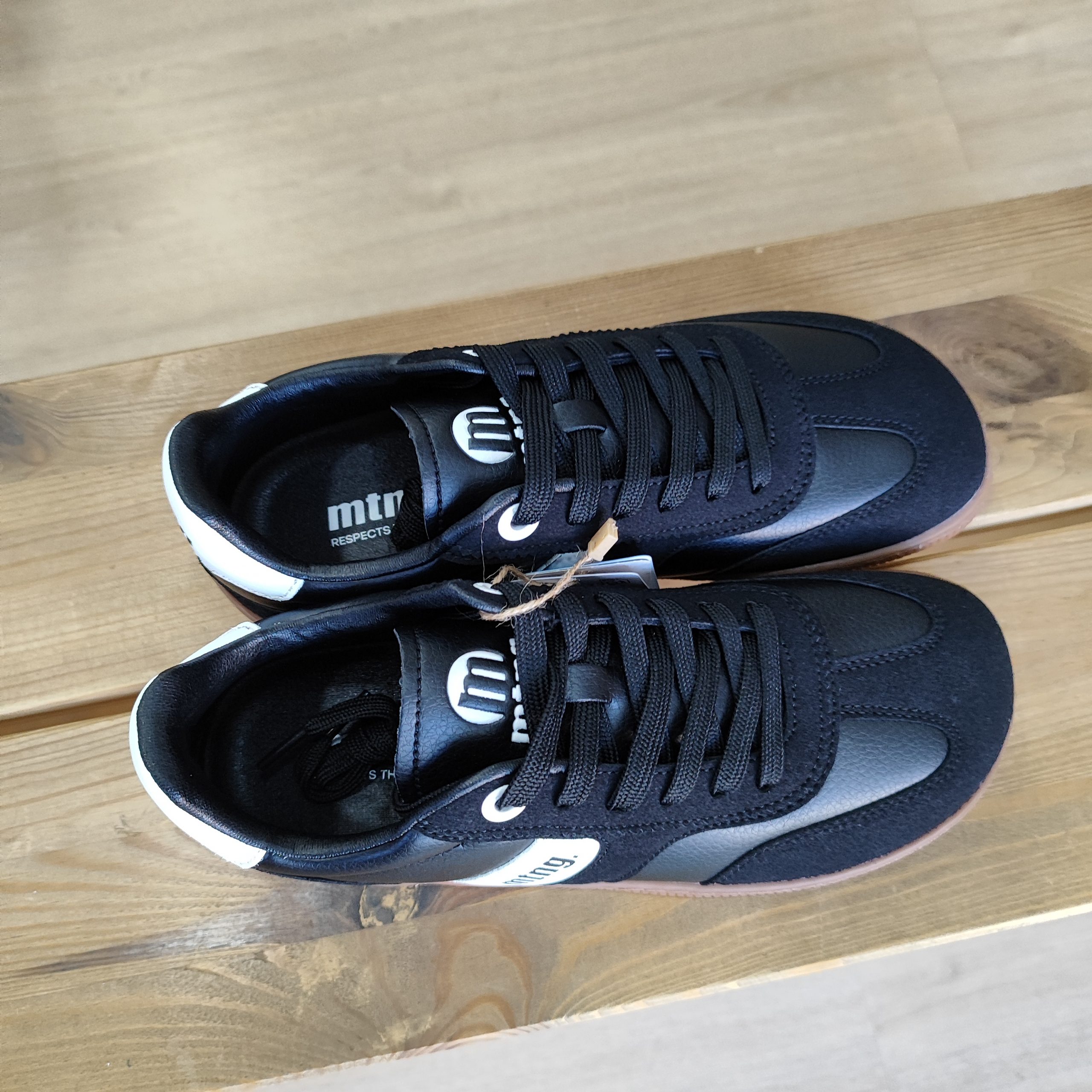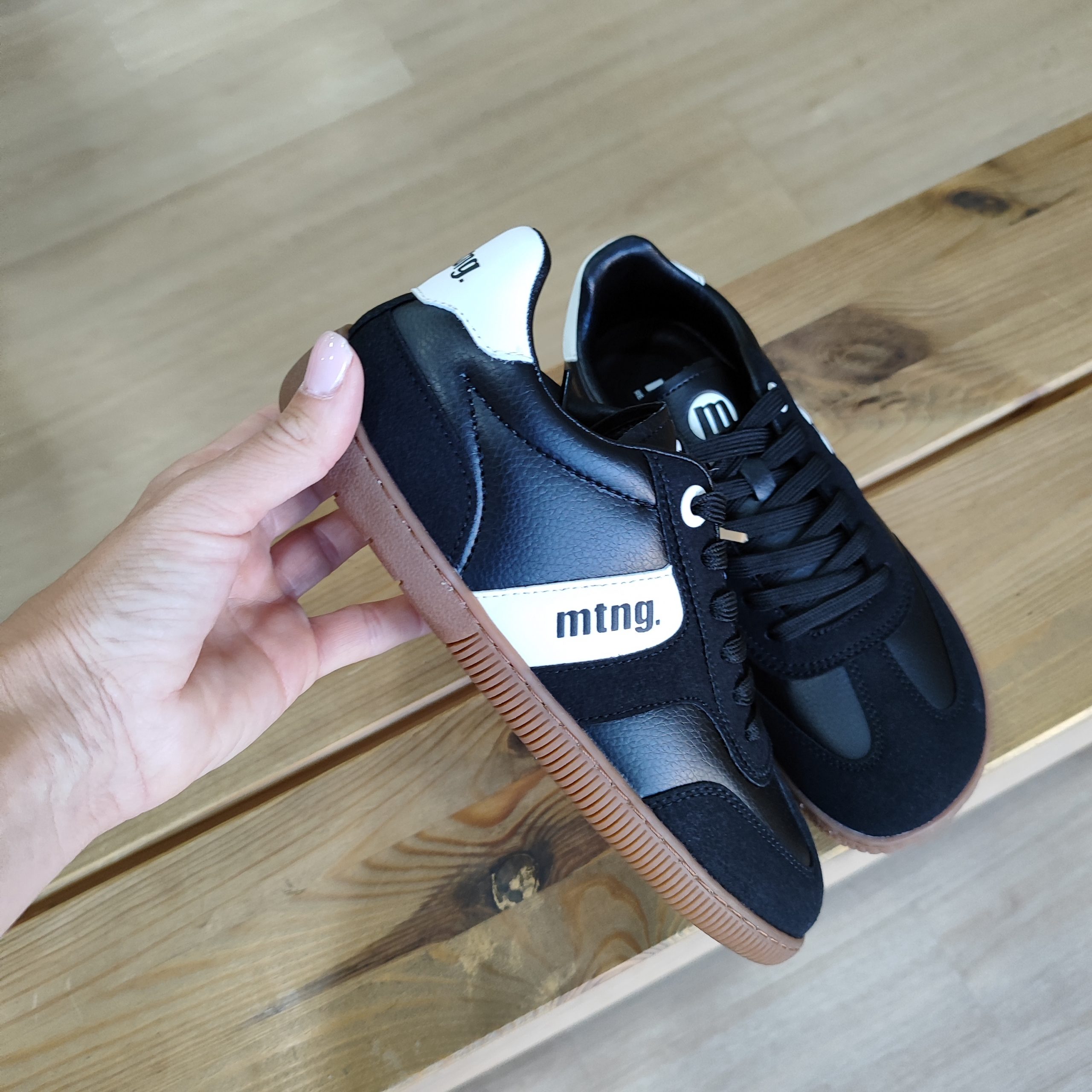 Zapatillas casual de color negro para mujer, modelo Free Aria de Mustang. Inspirada en el estilo retro indoor, esta zapatilla combina paneles de diferentes texturas en negro con detalle lateral blanco y suela de goma marrón. Su diseño bajo y ligero con cierre de cordones ofrece comodidad. Diseñadas y desarrolladas especialmente en colaboración con el Dr. Juanjo López, traumatólogo deportivo, para respetar el desarrollo natural del pie. Se trata de un calzado minimalista que gracias a su puntera ancha, suela totalmente plana (cero drop) y flexibilidad, mejora la anatomía del pie y favorece una mejor posición del mismo. Se vende con una plantilla de transición para hacer el cambio de calzado convencional a minimalista de manera progresiva. Con certificado VEGANO sellado por INESCOP, el cual garantiza que la naturaleza química principal del material no se corresponde con fibras de origen animal.