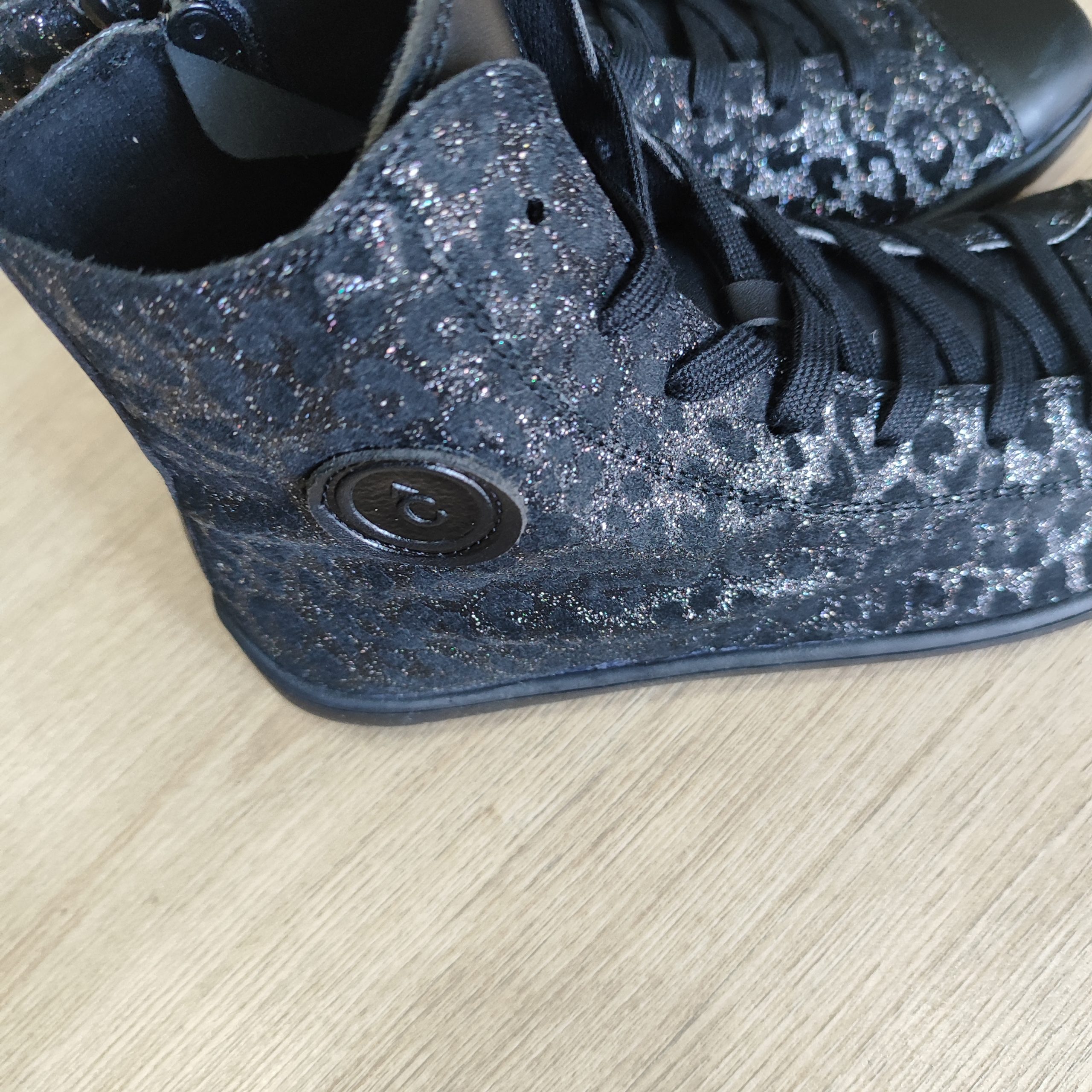 Su diseño con cordones ajustables proporciona una sujeción segura y adaptable, mientras que su acabado “brilli-brilli” efecto galaxia convierte este modelo en una opción versátil tanto para el día a día como para looks más atrevidos.