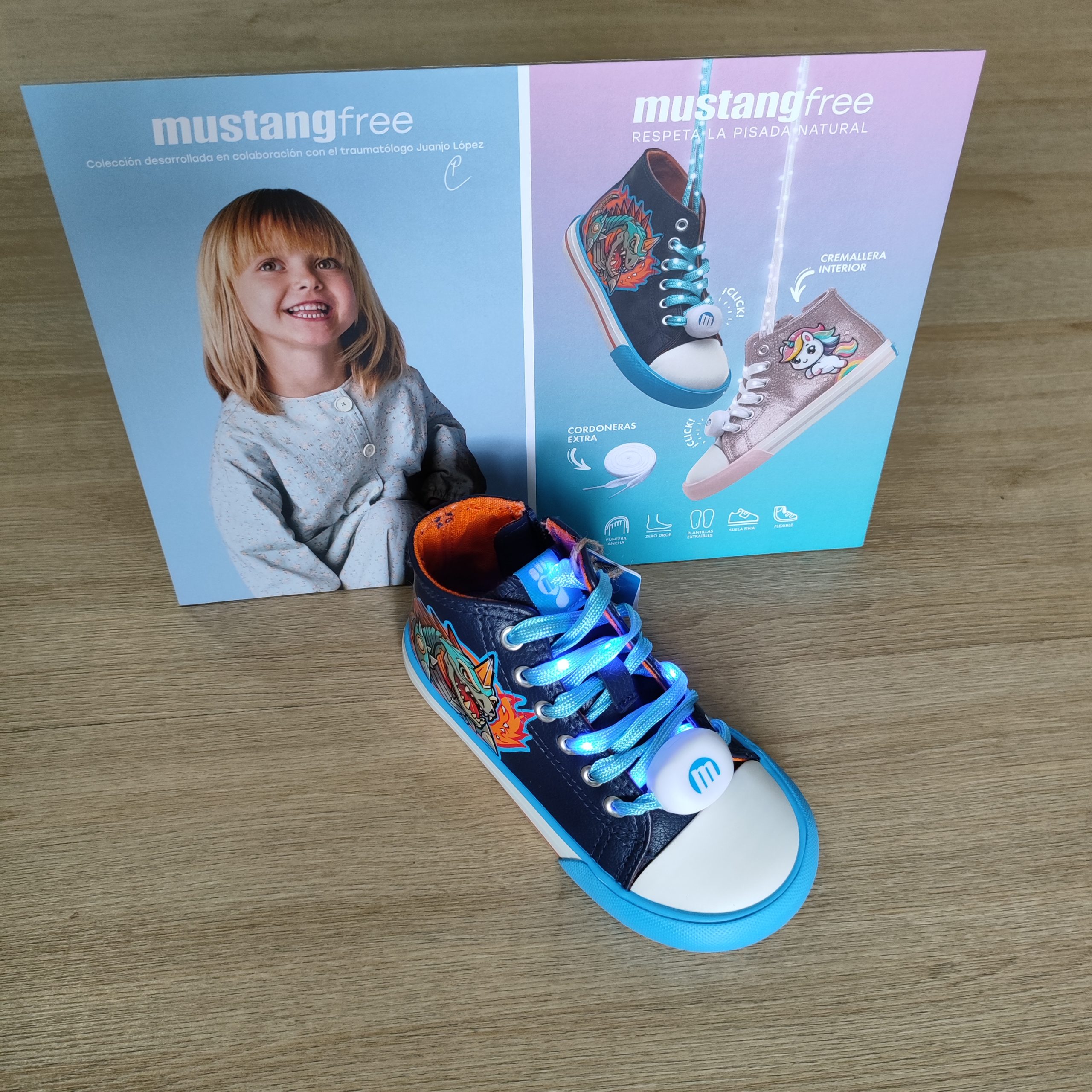 Zapatillas barefoot con luces que respetan el desarrollo natural del pie. Zapatillas barefoot tipo botín de color azul marino con luces para niño, modelo Free Mustang, de estilo urbano con un diseño llamativo. Este modelo incorpora cordones de luces que se activan mediante botón, aportando un toque interactivo y divertido. Destaca el estampado lateral de…