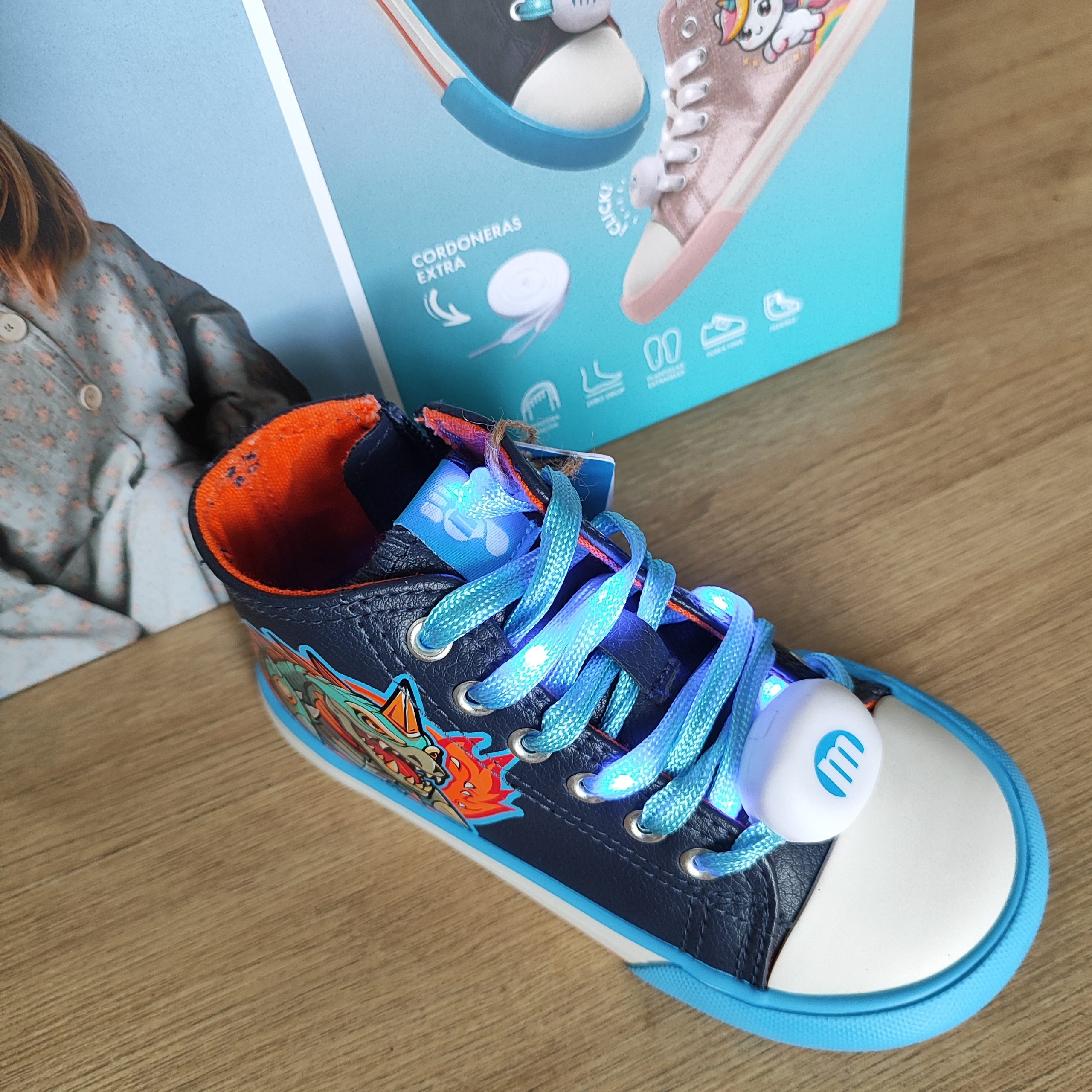 Zapatillas barefoot tipo botín de color azul marino con luces para niño, modelo Free Mustang, de estilo urbano con un diseño llamativo. Este modelo incorpora cordones de luces que se activan mediante botón, aportando un toque interactivo y divertido. Destaca el estampado lateral de un dragón mecánico con efecto fuego, combinado con puntera blanca y detalles en azul turquesa y naranja que realzan su estilo dinámico. Diseñado y desarrollado especialmente en colaboración con el Dr. Juanjo López, traumatólogo deportivo e infantil, para respetar el desarrollo natural del pie del niño y la niña. Gracias a su puntera ancha permite el libre movimiento de los dedos dentro del zapato. Las plantillas extraíbles facilitan comprobar si la talla del calzado es la correcta para tu hijo. Además, su fácil apertura facilita que el niño pueda descalzarse y calzarse de forma autónoma.