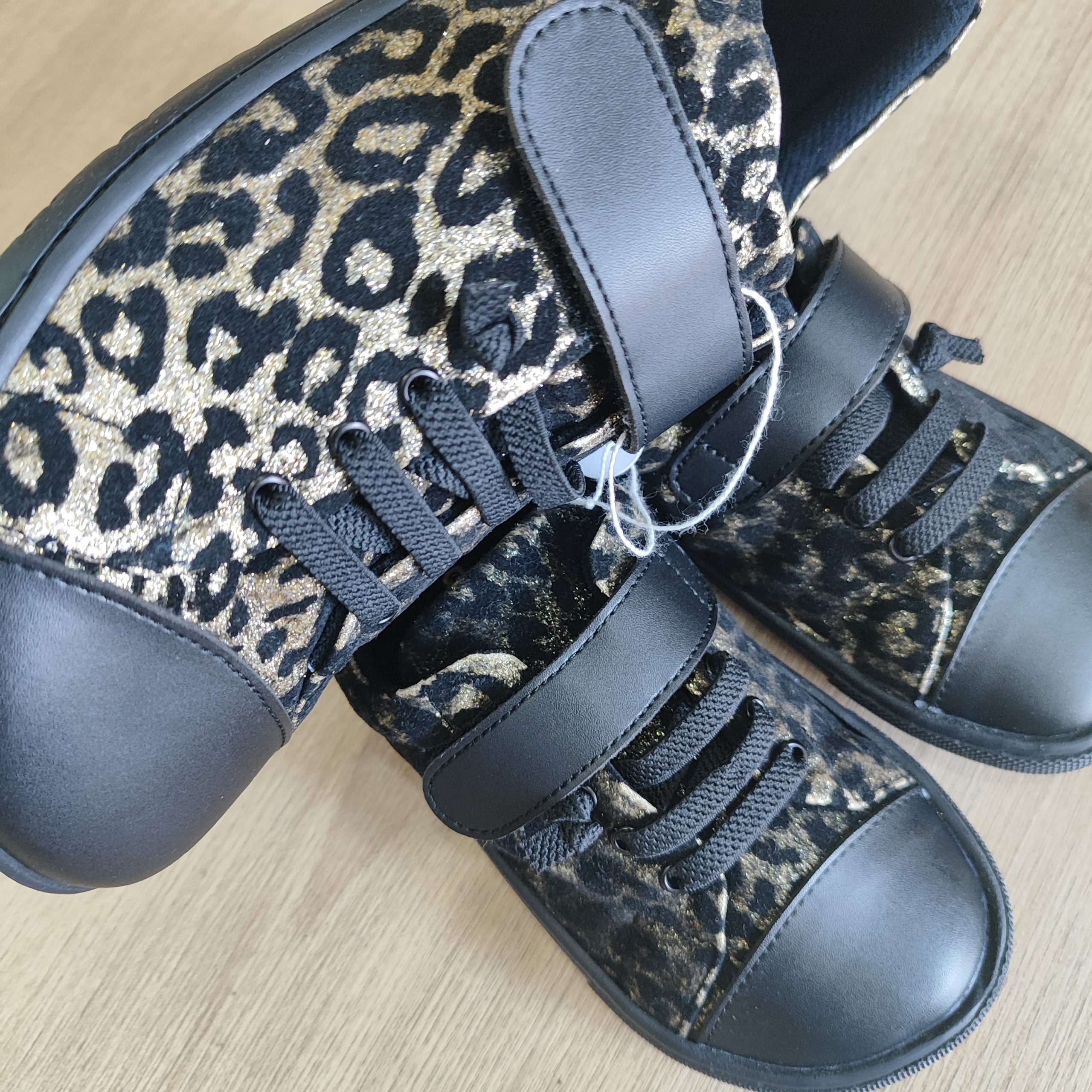Descubre la deportiva Coqueflex modelo 15539, un calzado con estilo y comodidad para el día a día. Fabricada en micropel brillante negro, presenta un diseño exclusivo tipo leopardo negro con fondo dorado, ideal para quienes buscan un toque de elegancia moderna en un zapato deportivo.