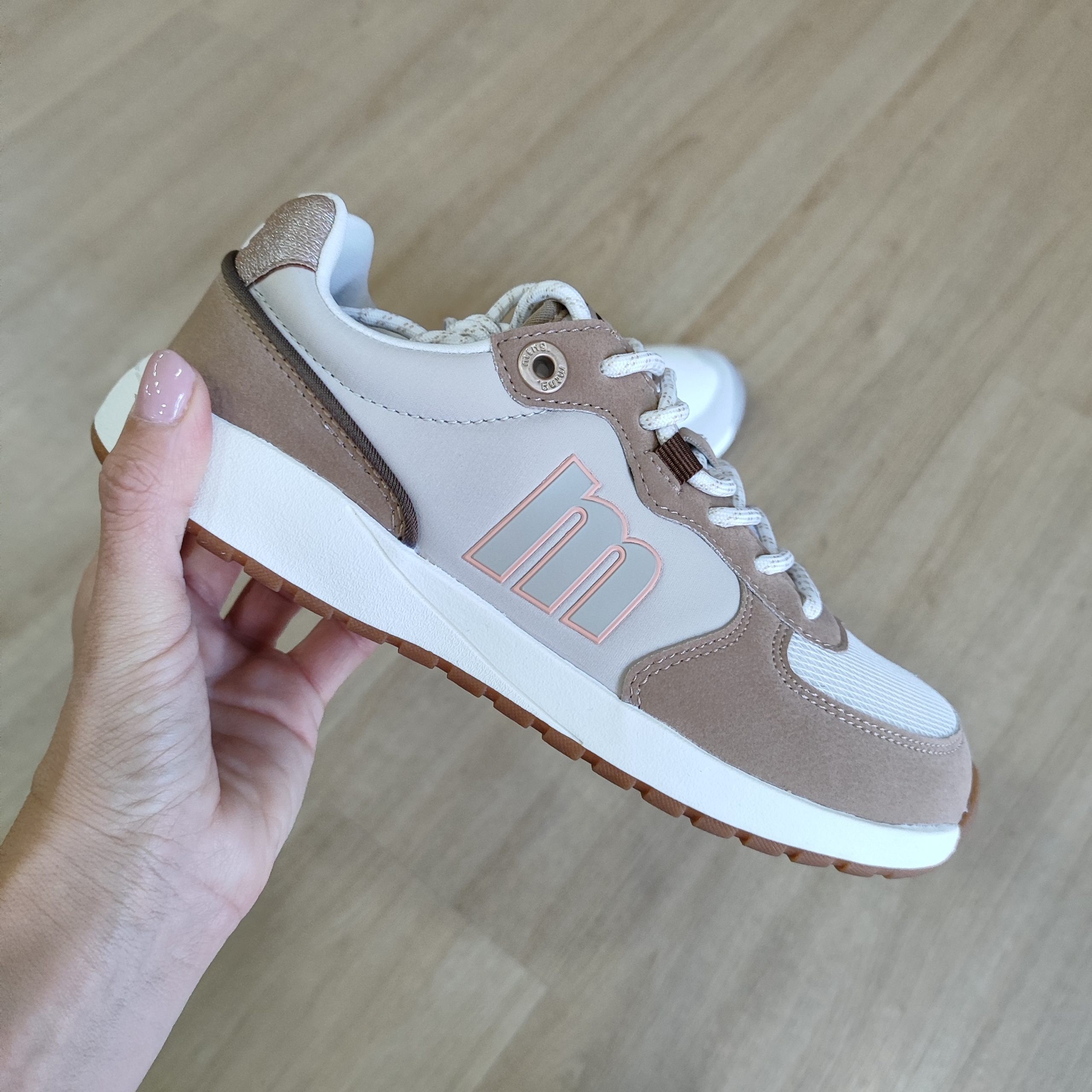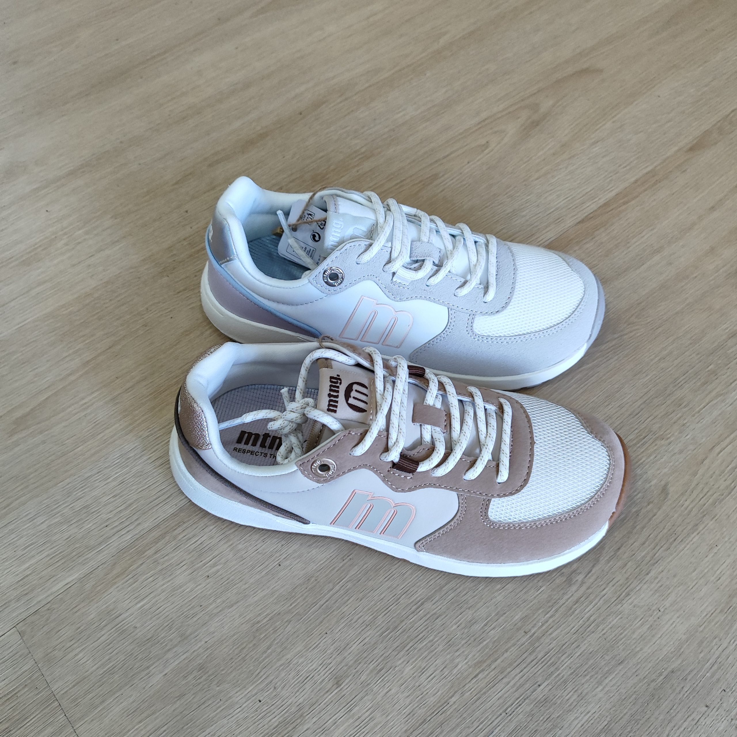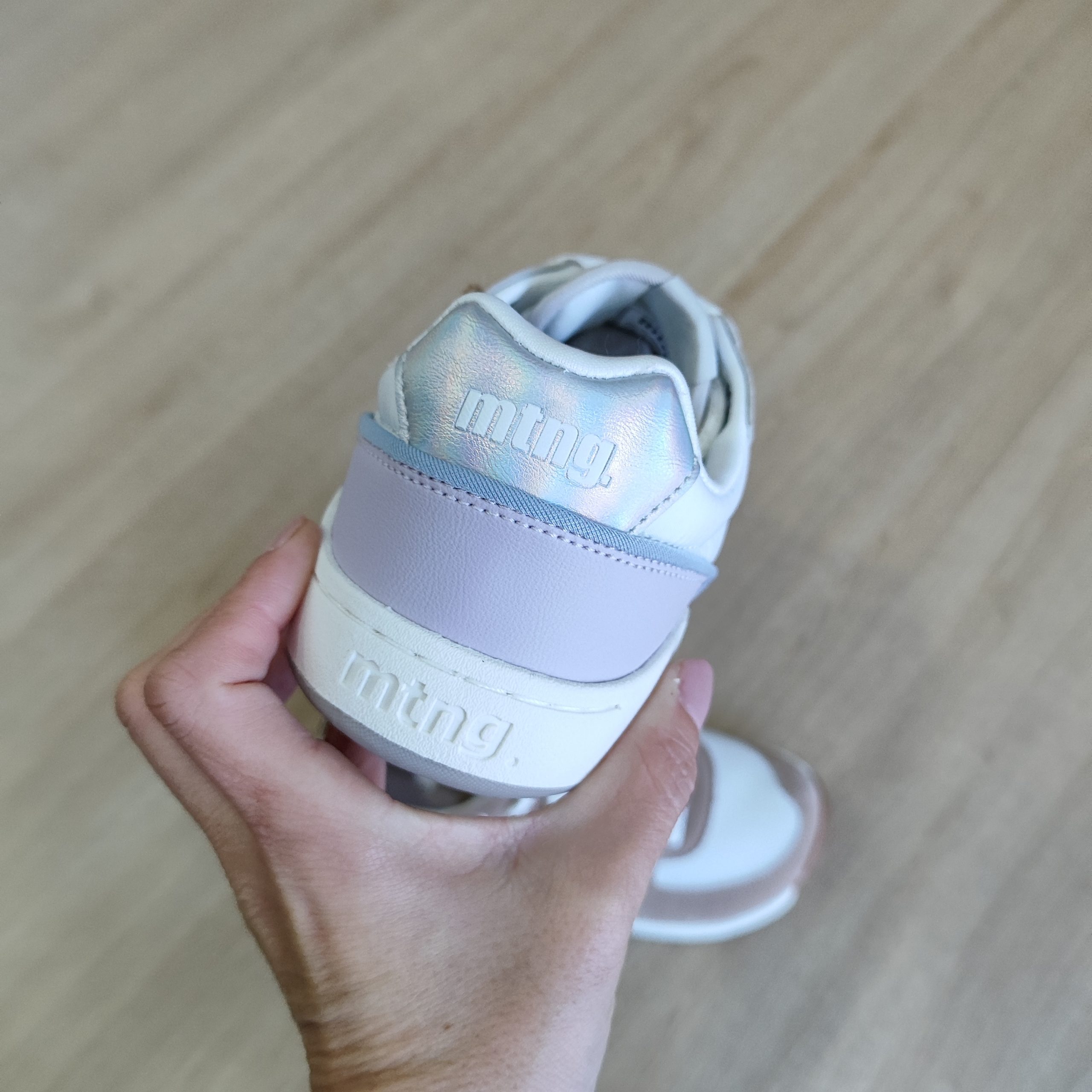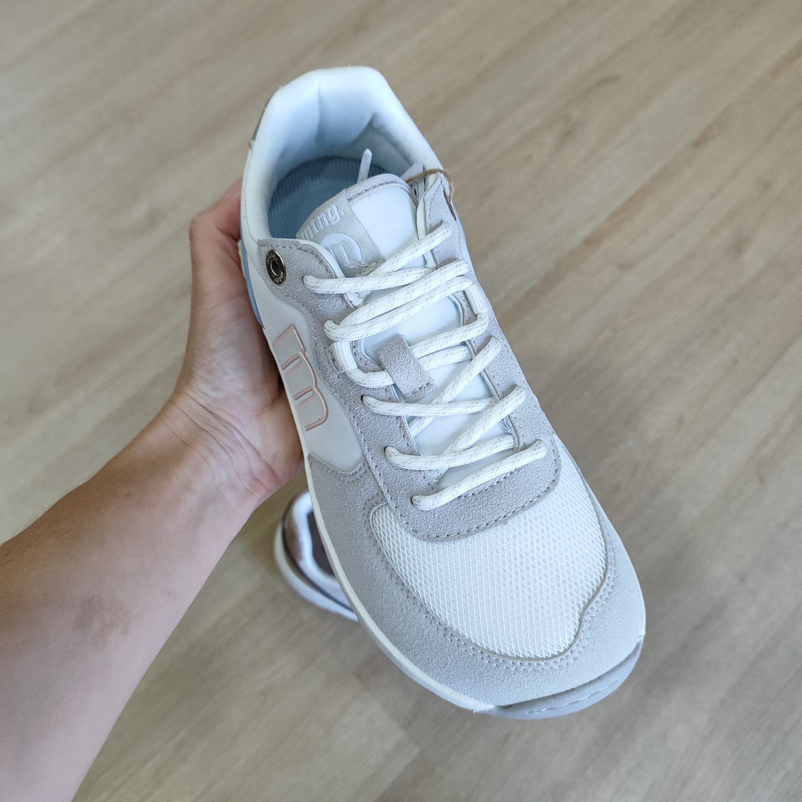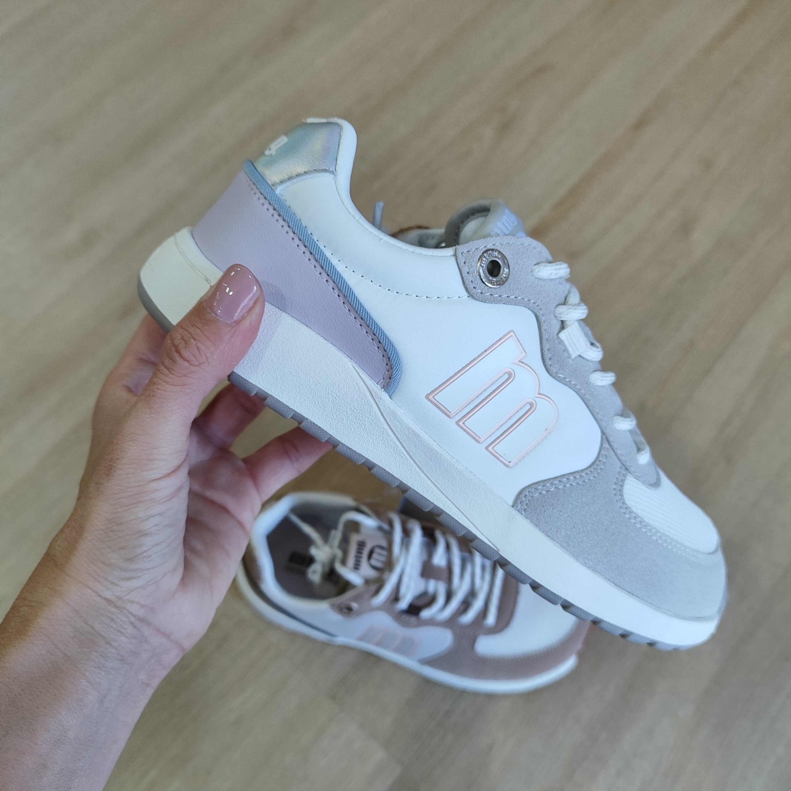 Zapatillas barefoot para mujer, modelo Free Apolo de la marca Mustang de color blanco. Presenta una combinación de texturas con piezas en gris claro, detalles en lila y azul suave, y refuerzo trasero con acabado iridiscente. El diseño incorpora cierre con cordones y logo lateral en contraste. Diseñadas y desarrolladas especialmente en colaboración con el Dr. Juanjo López, traumatólogo deportivo, para respetar el desarrollo natural del pie. Se trata de un calzado minimalista que gracias a su puntera ancha, suela totalmente plana (cero drop) y flexibilidad, mejora la anatomía del pie y favorece una mejor posición del mismo. Se vende con una plantilla de transición para hacer el cambio de calzado convencional a minimalista de manera progresiva. Perfecta para quienes buscan un estilo deportivo con un toque de color.