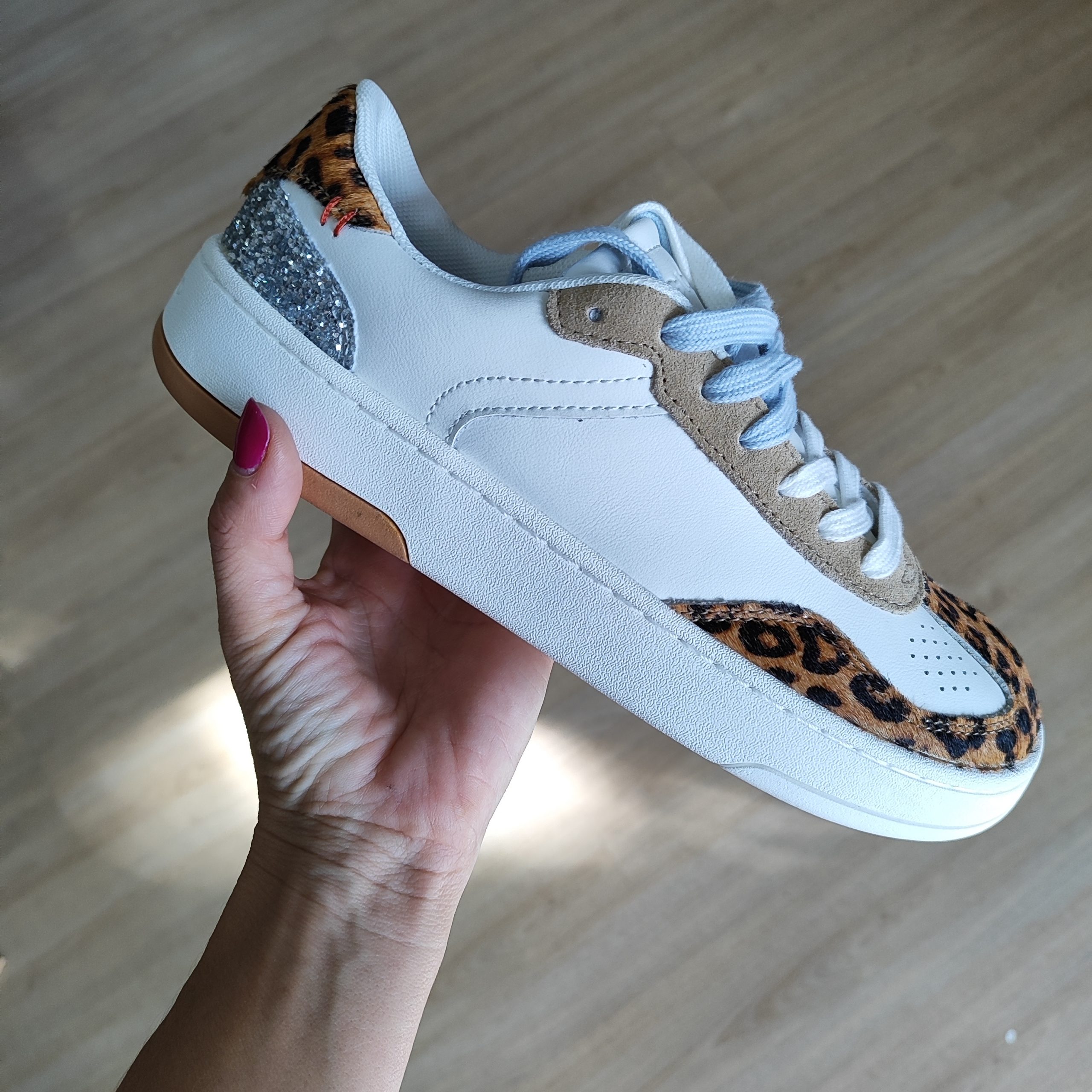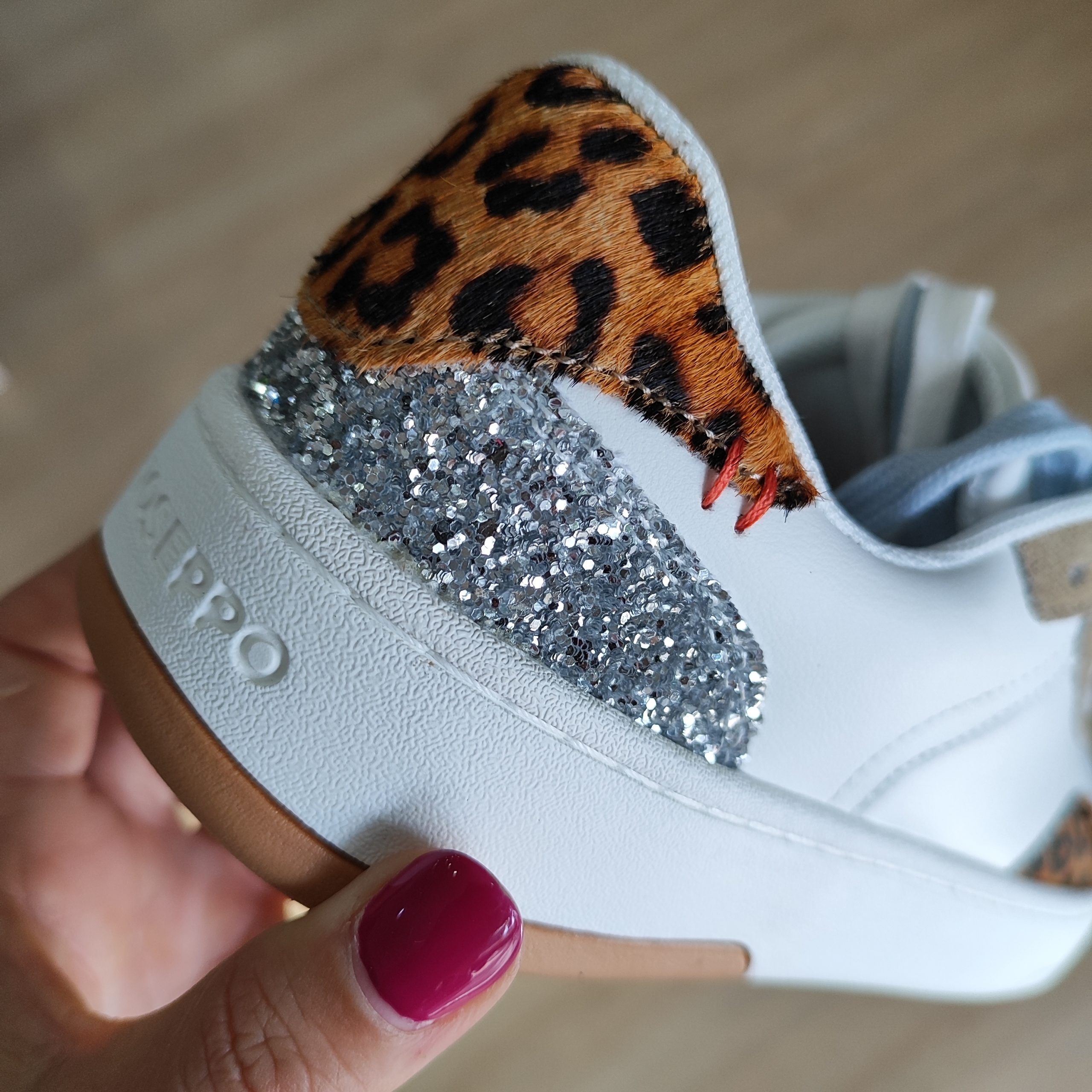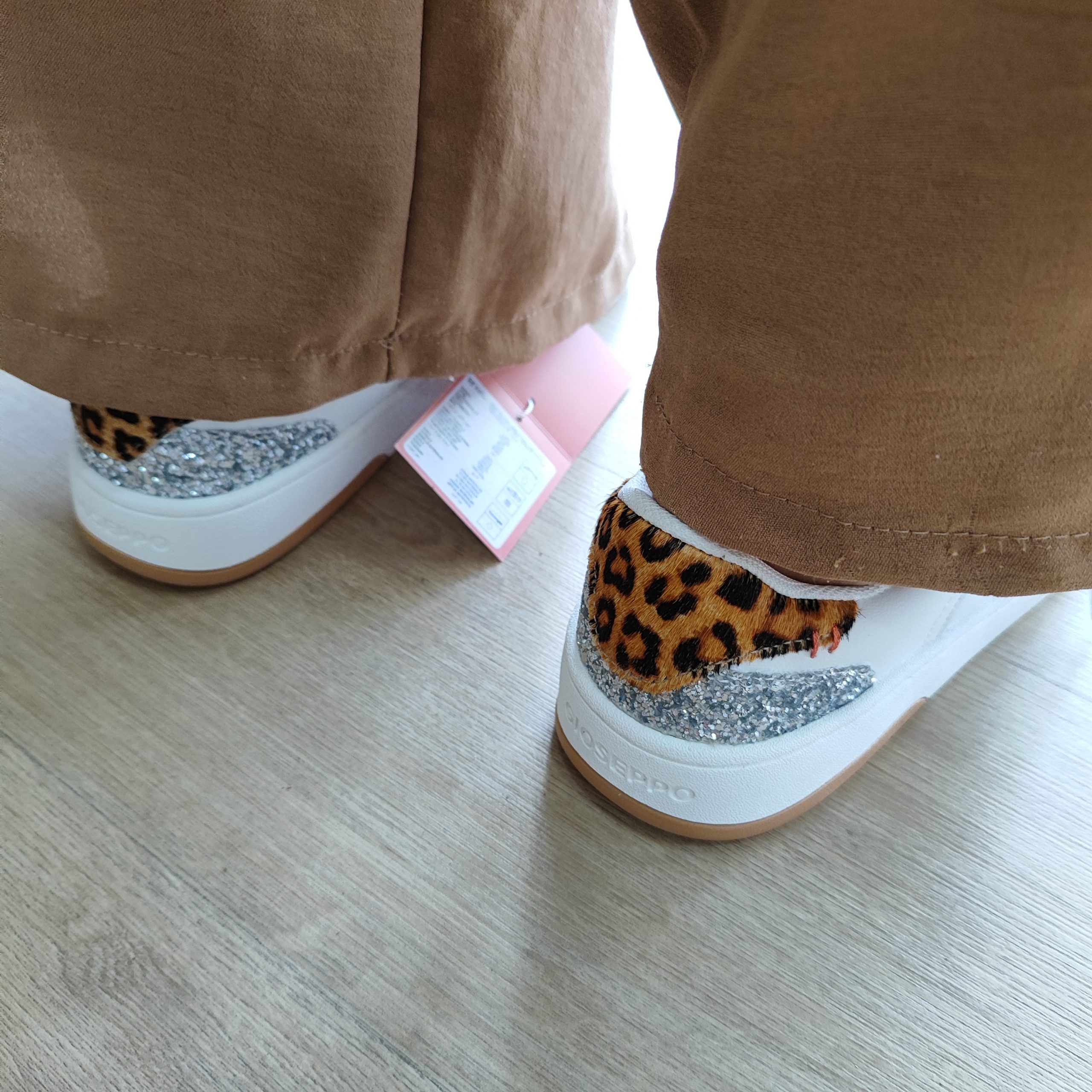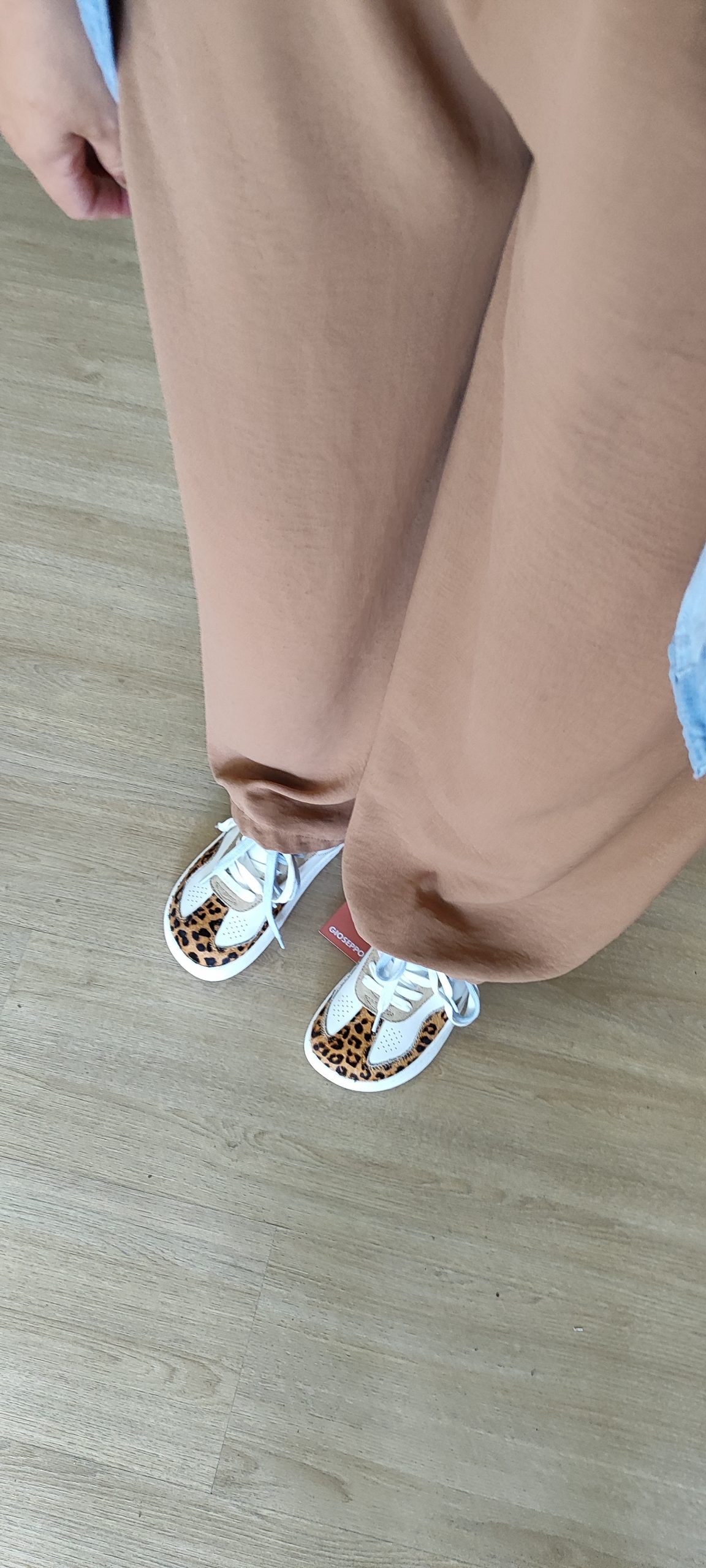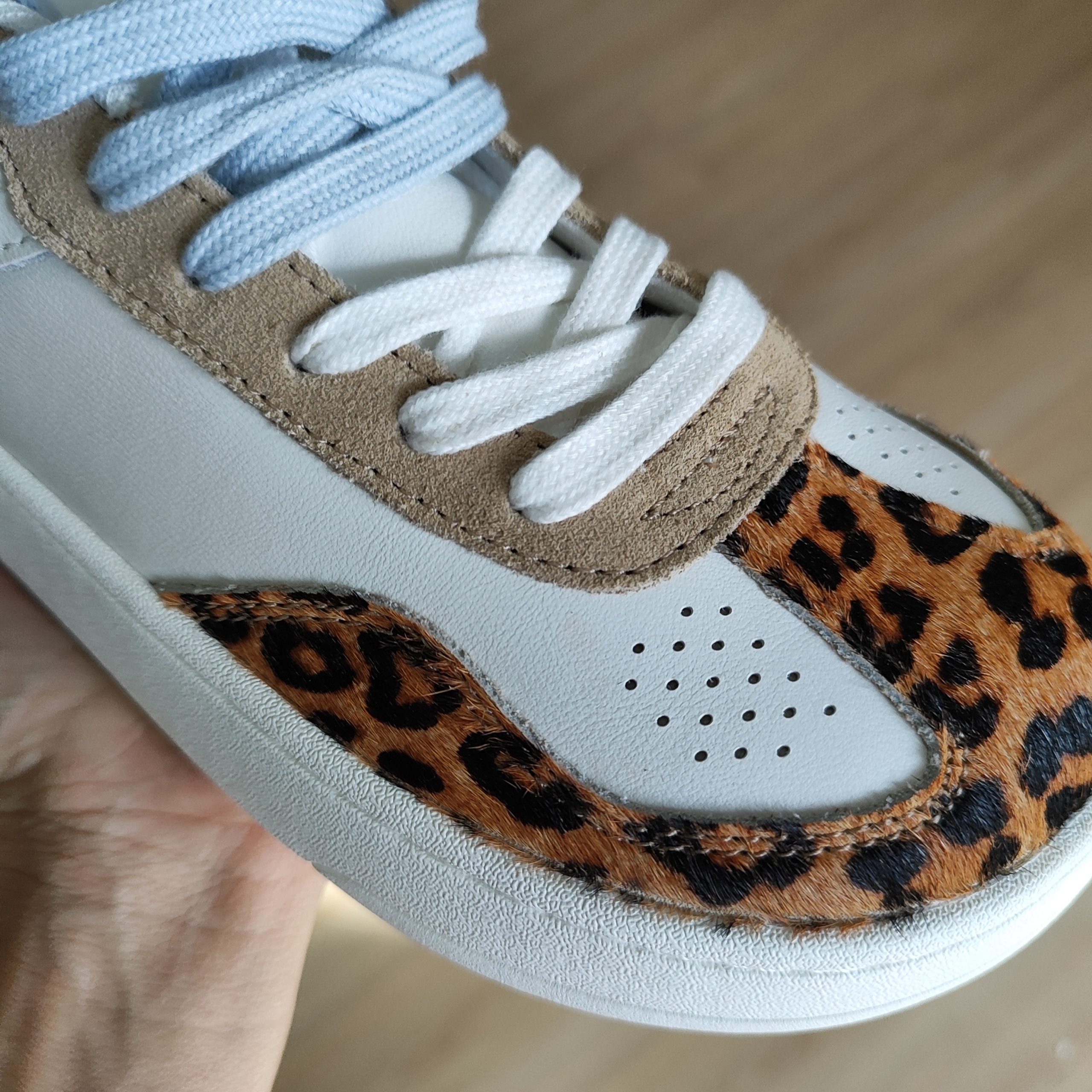 Zapatillas de piel con estampado de leopardo y brillo. Diseñadas siguiendo las tendencias minimalistas para garantizar la pisada natural. Incluyen doble cordón y una plantilla de transición para facilitar una adaptación progresiva a quienes se inician en el calzado barefoot. Suela fina con embellecedor estético. Las posibles variaciones en la piel o en el acabado entre ambos pies reflejan la autenticidad del proceso artesanal y del uso de pieles naturales. Características especiales: Flexible y torsionable. Sin refuerzos que ferulicen. Suela plana y flexible de caucho. Puntera amplia. Sin desnivel (drop cero). Corte de piel y glitter. Forro y planta de poliéster transpirable. Suela de caucho flexible.