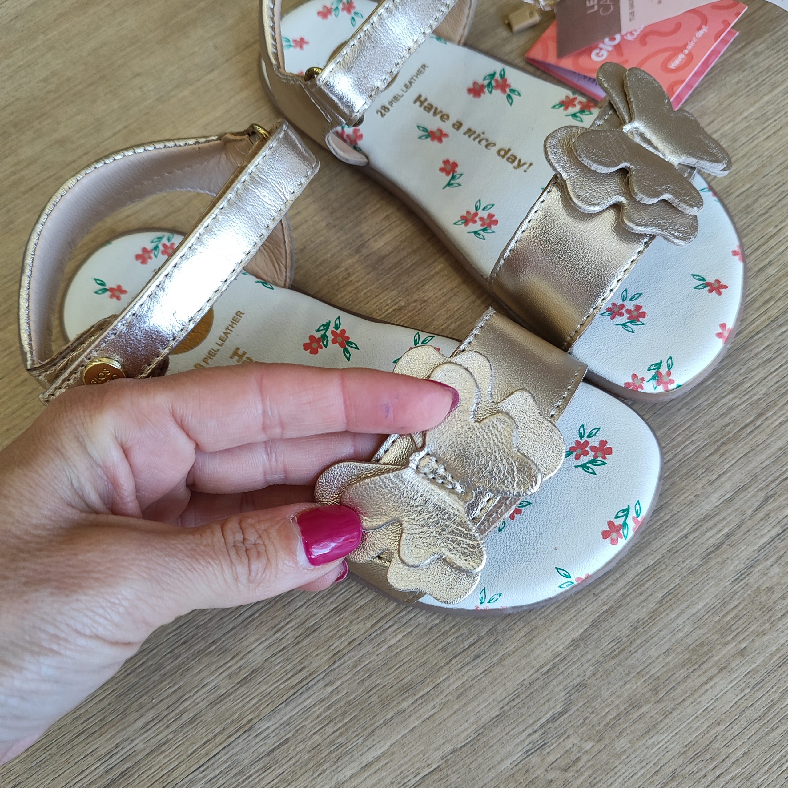 Sandalias de piel metalizada con detalle de mariposa. Planta estampada. Diseñadas siguiendo las tendencias minimalistas para garantizar la pisada natural. Cuentan con cierres ajustables en el tobillo.