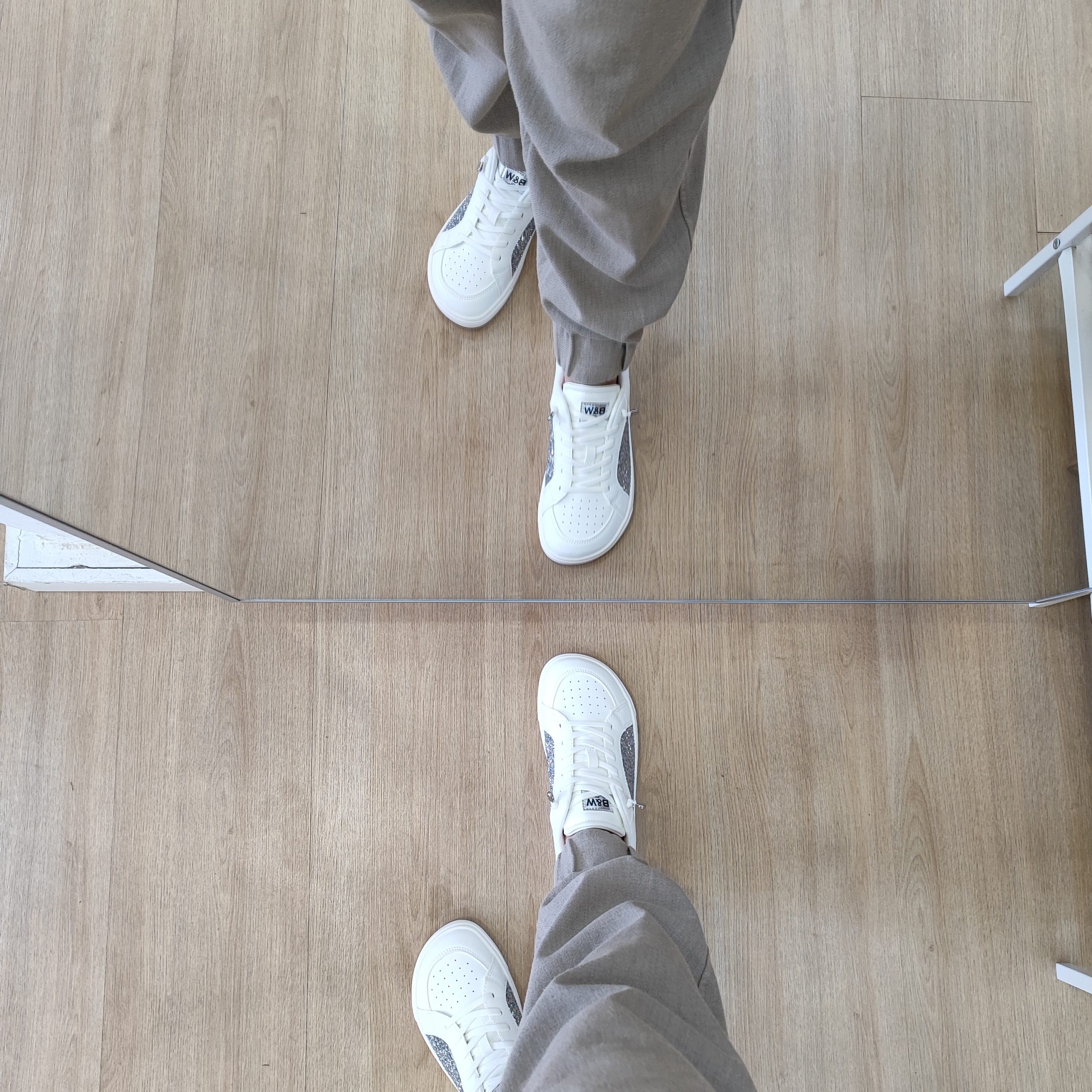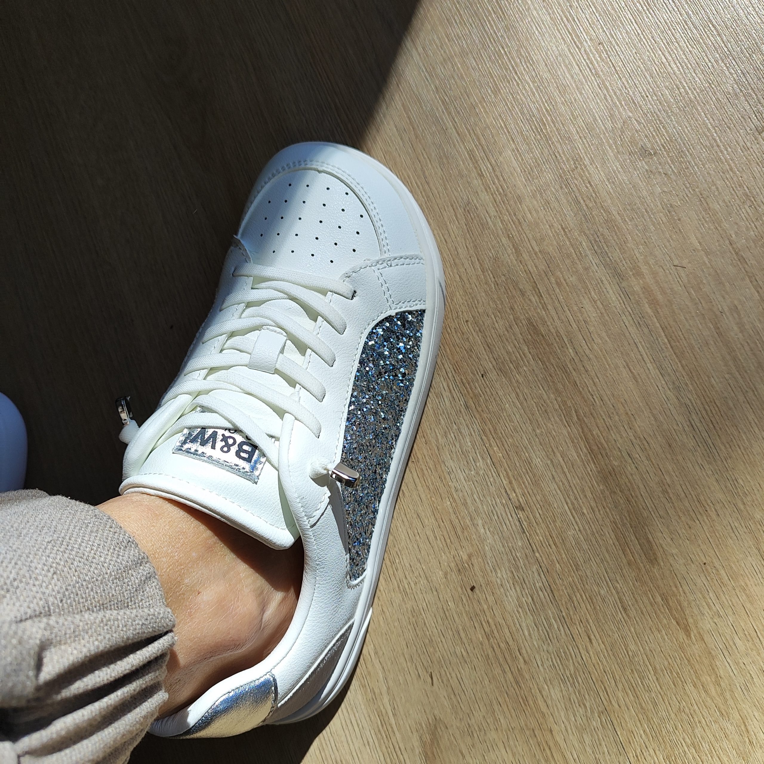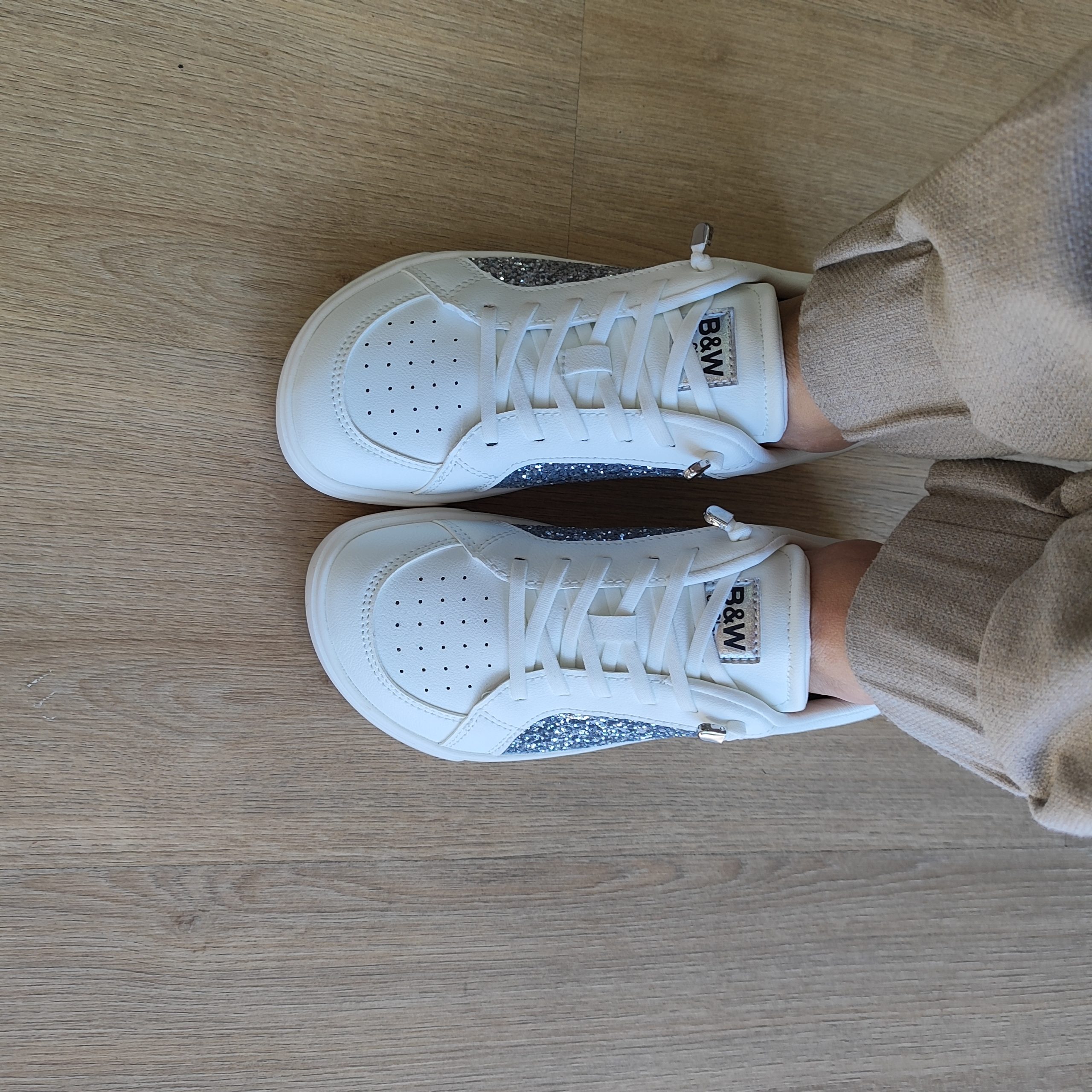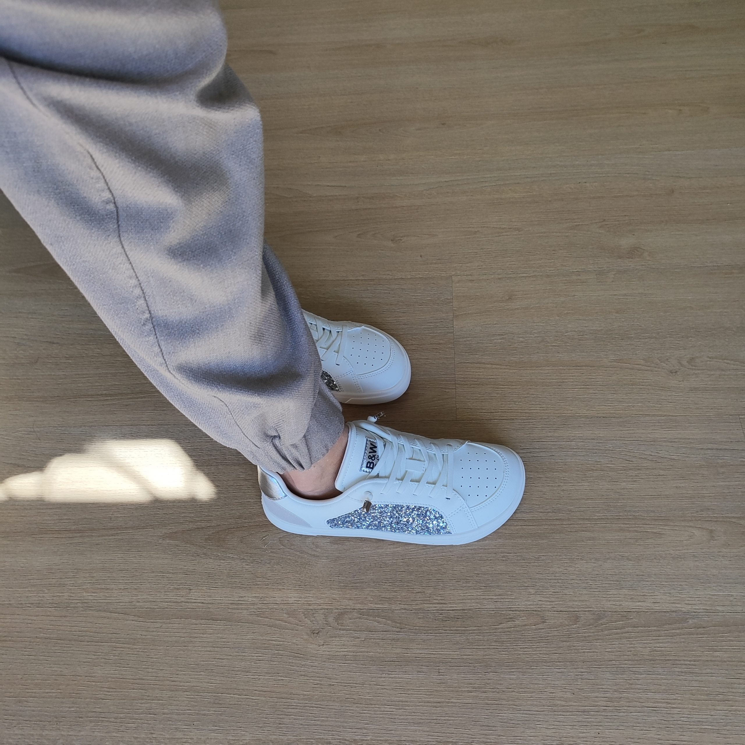 Zapatillas barefoot blancas con detalle lateral en glitter plateado, diseñadas para el uso diario con un ajuste flexible y respetuoso con la forma natural del pie. Los materiales ligeros reducen el peso para facilitar el movimiento.