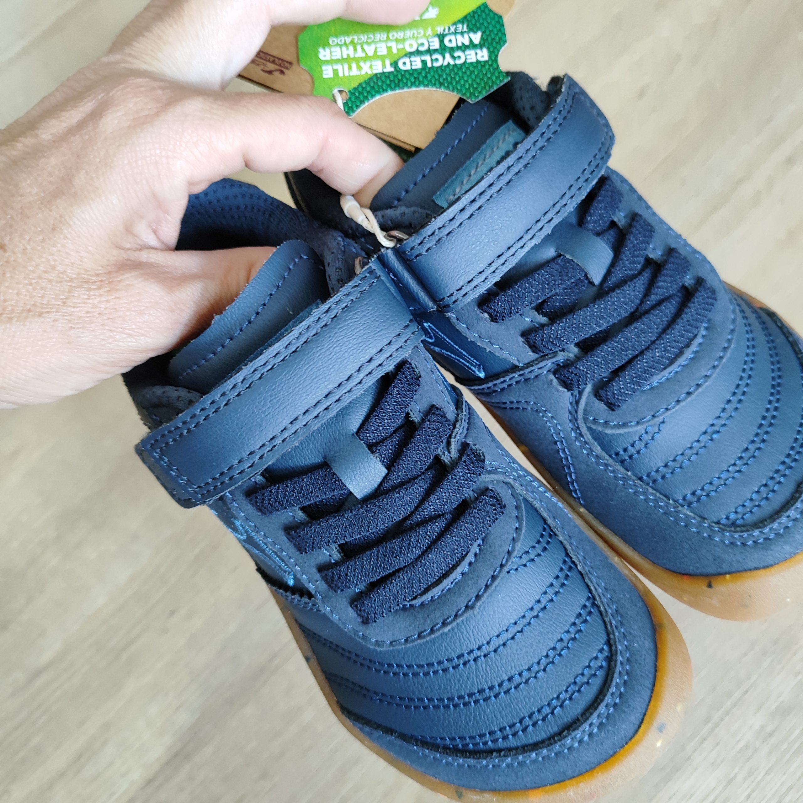 El upper está elaborado con piel reciclada de alta calidad, que combina transpirabilidad, flexibilidad y protección para los pies más pequeños.